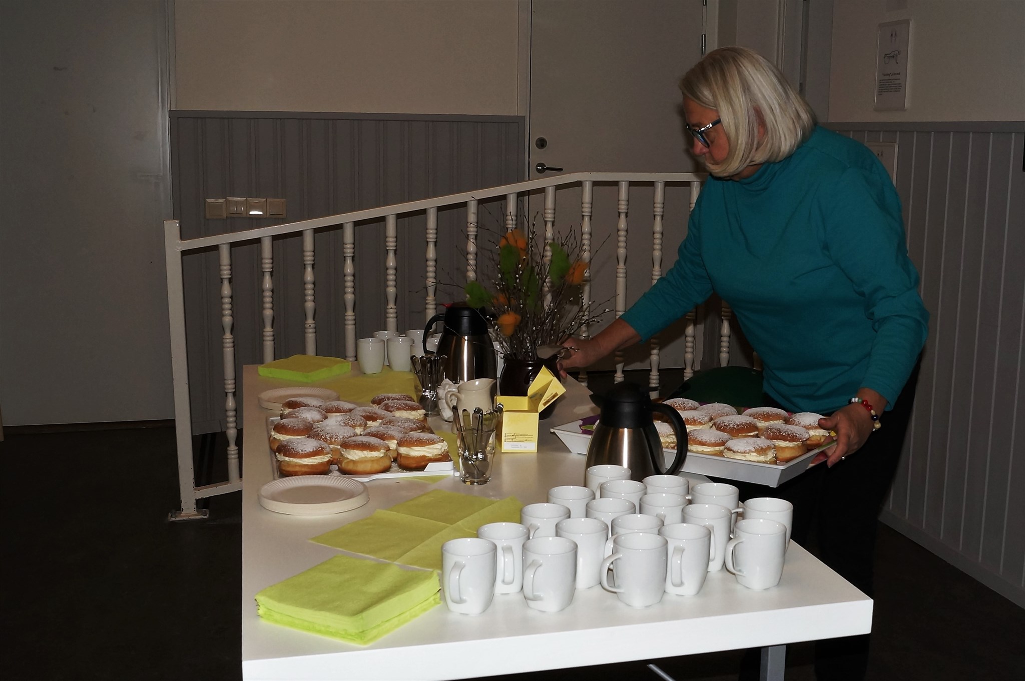 Dags för kaffe och semla. Eva Kalnins dukar fram.