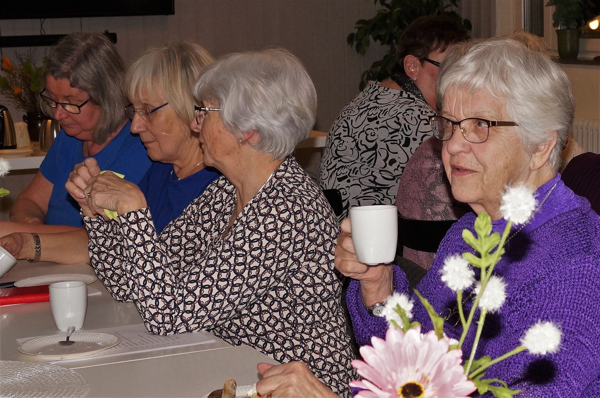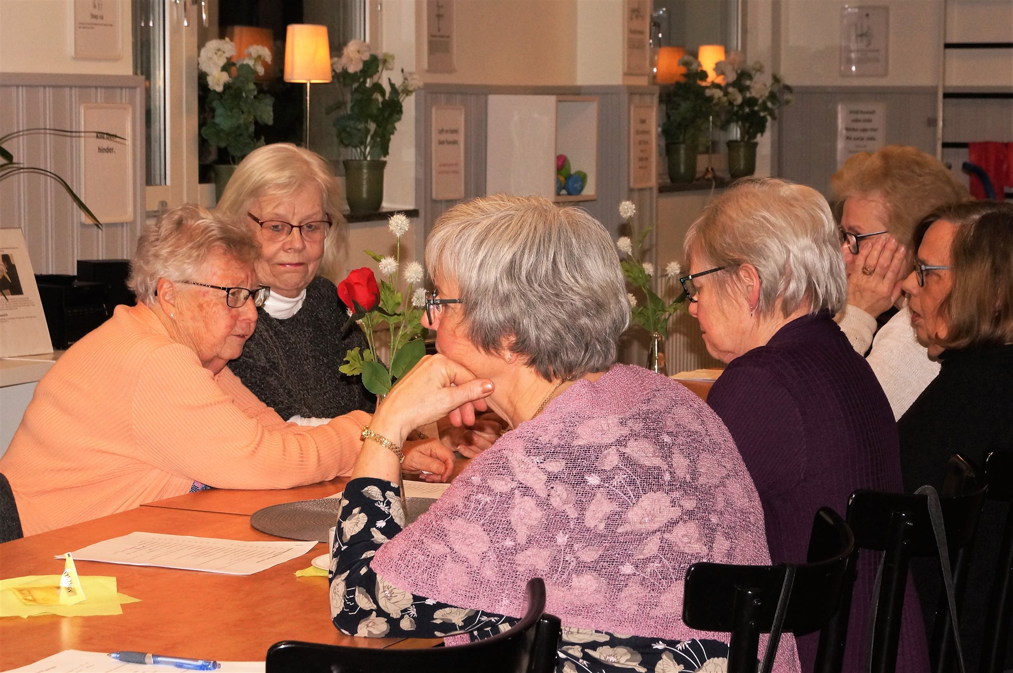 Ingrid Johansson, Marianne Avelin, Gunnel Eriksson, Agneta Lennqvist, Stina Öryds och Helena Bergström i samtal vid kaffebordet.
