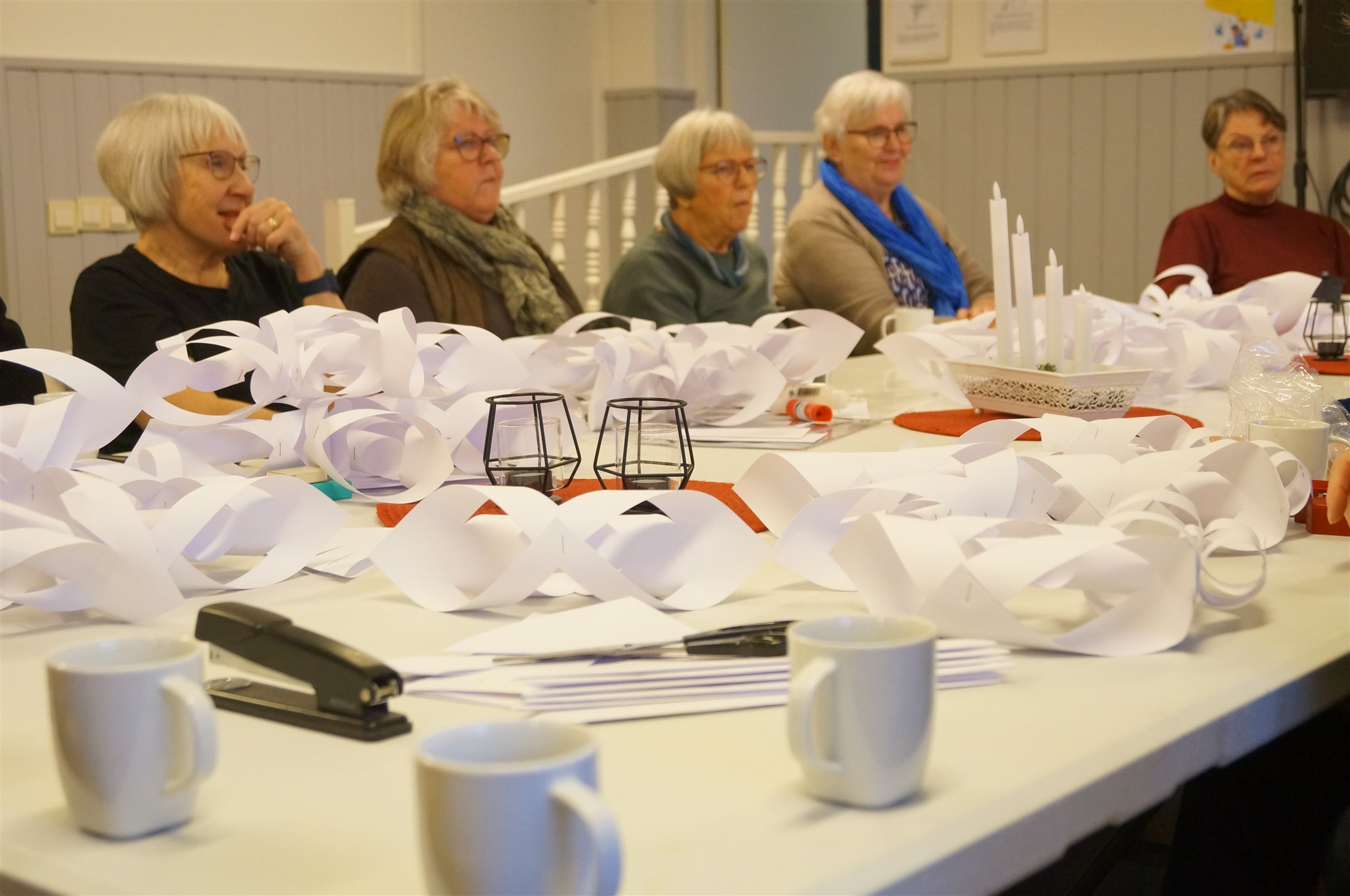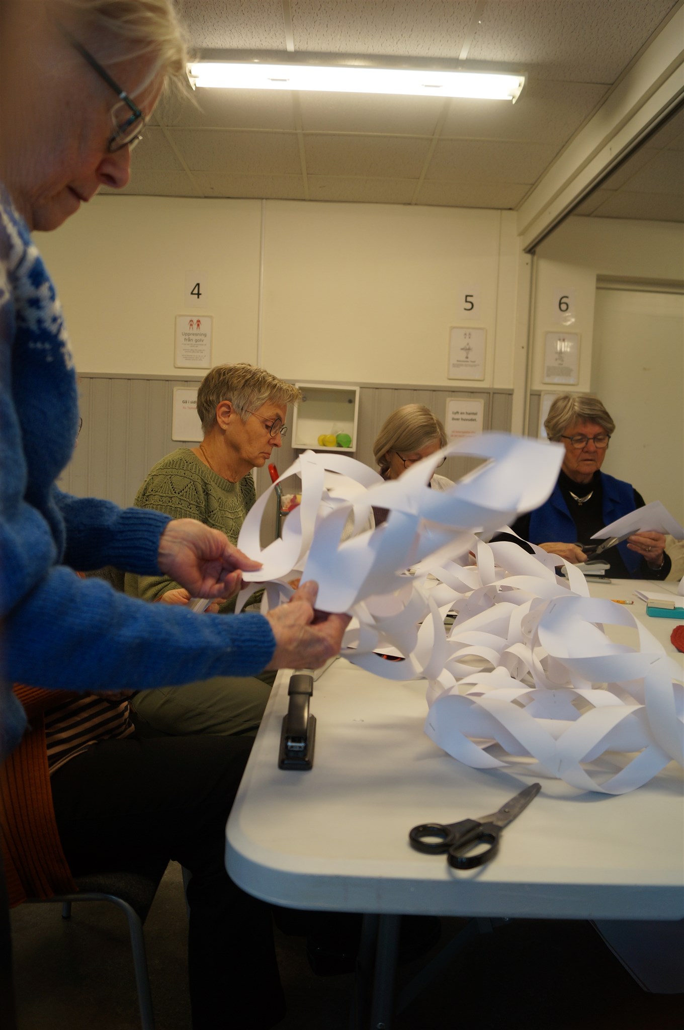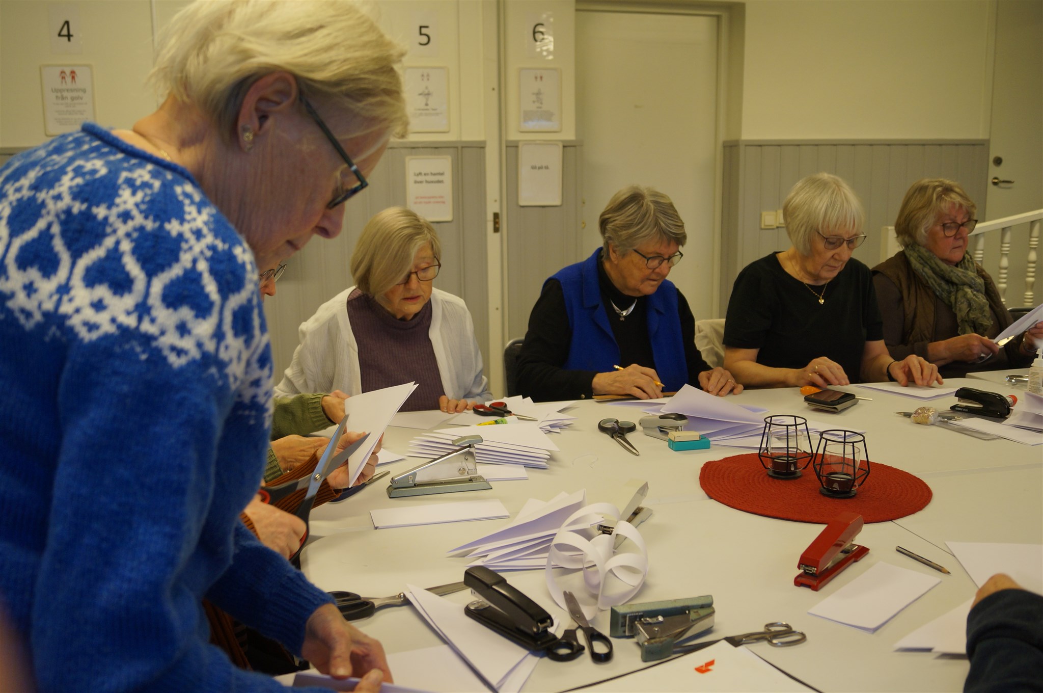 Oj vad mycket pappersremsor det går åt. Gunilla Andersson, Marianne Strandlund, Gunnel Eriksson, Ann-Sofie Lundin och Lena Hedman tar en kaffepaus.