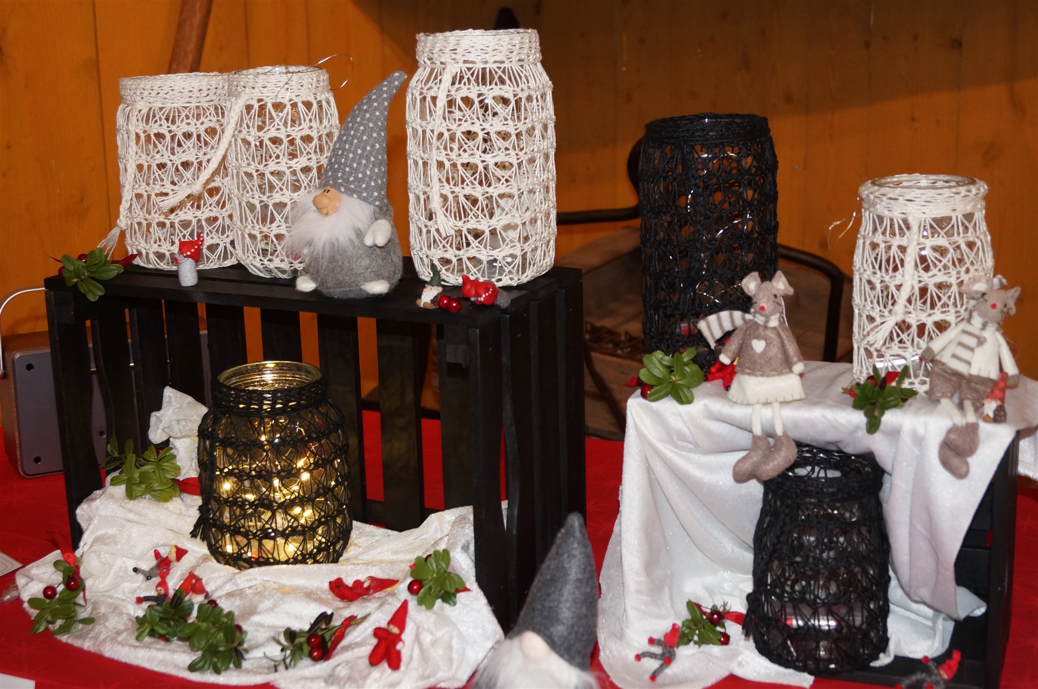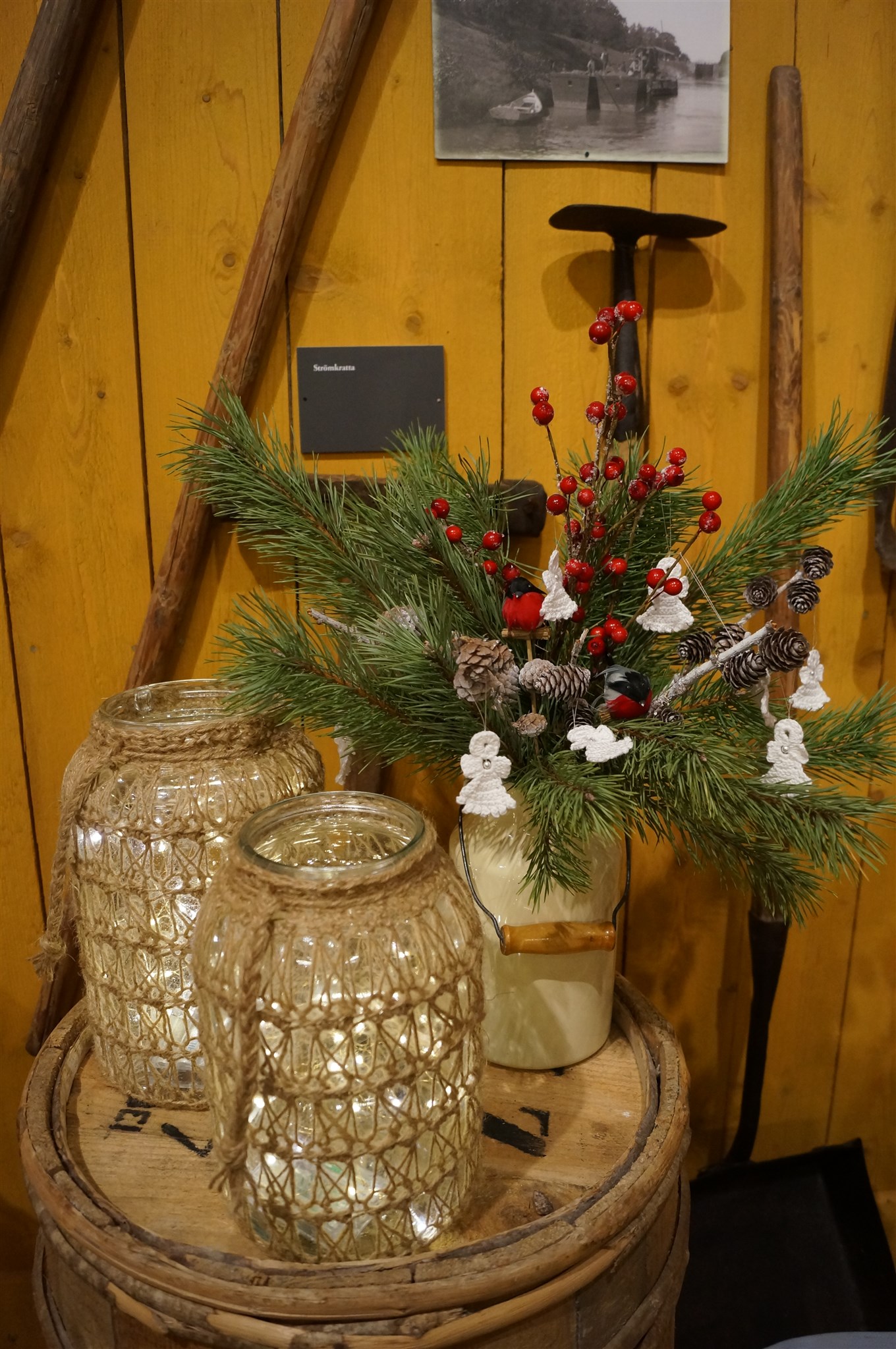 Ljuslyktor i kvastskaftsteknik samt granprydnader.