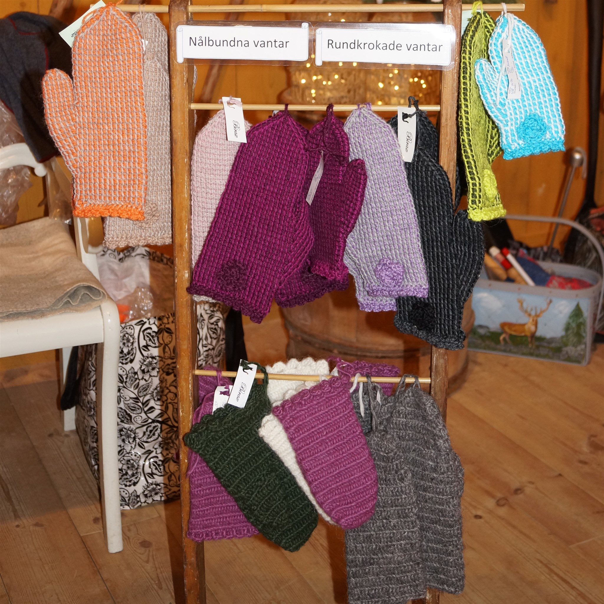 Krokade och nålbundna vantar från Birgitta Wolters tillverkning.