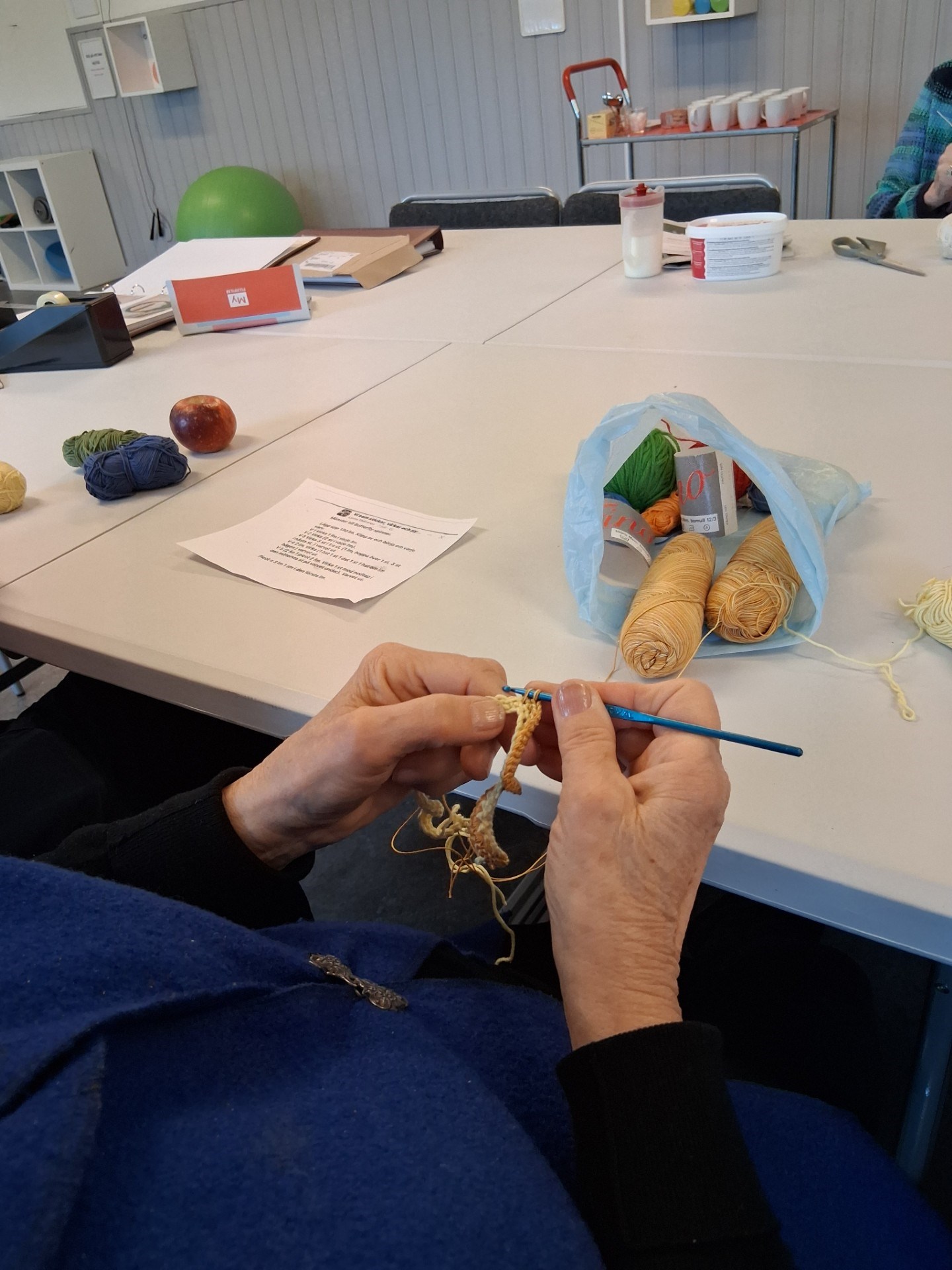 Vid årets första kvällsträff så tillverkades virkade mobilsnurror. Marianne Strandlund visade hur det går till.